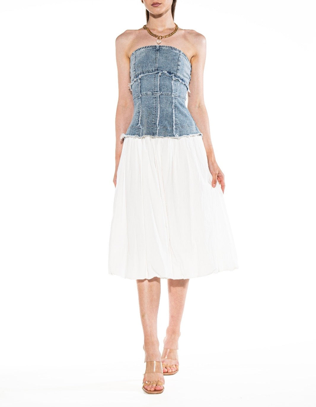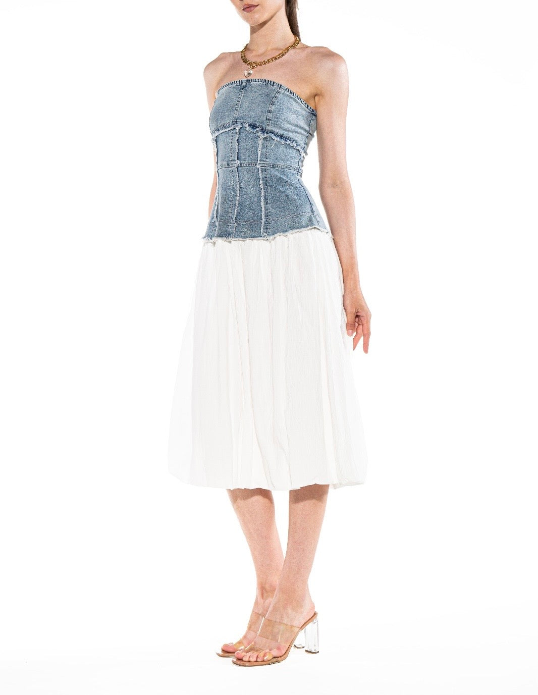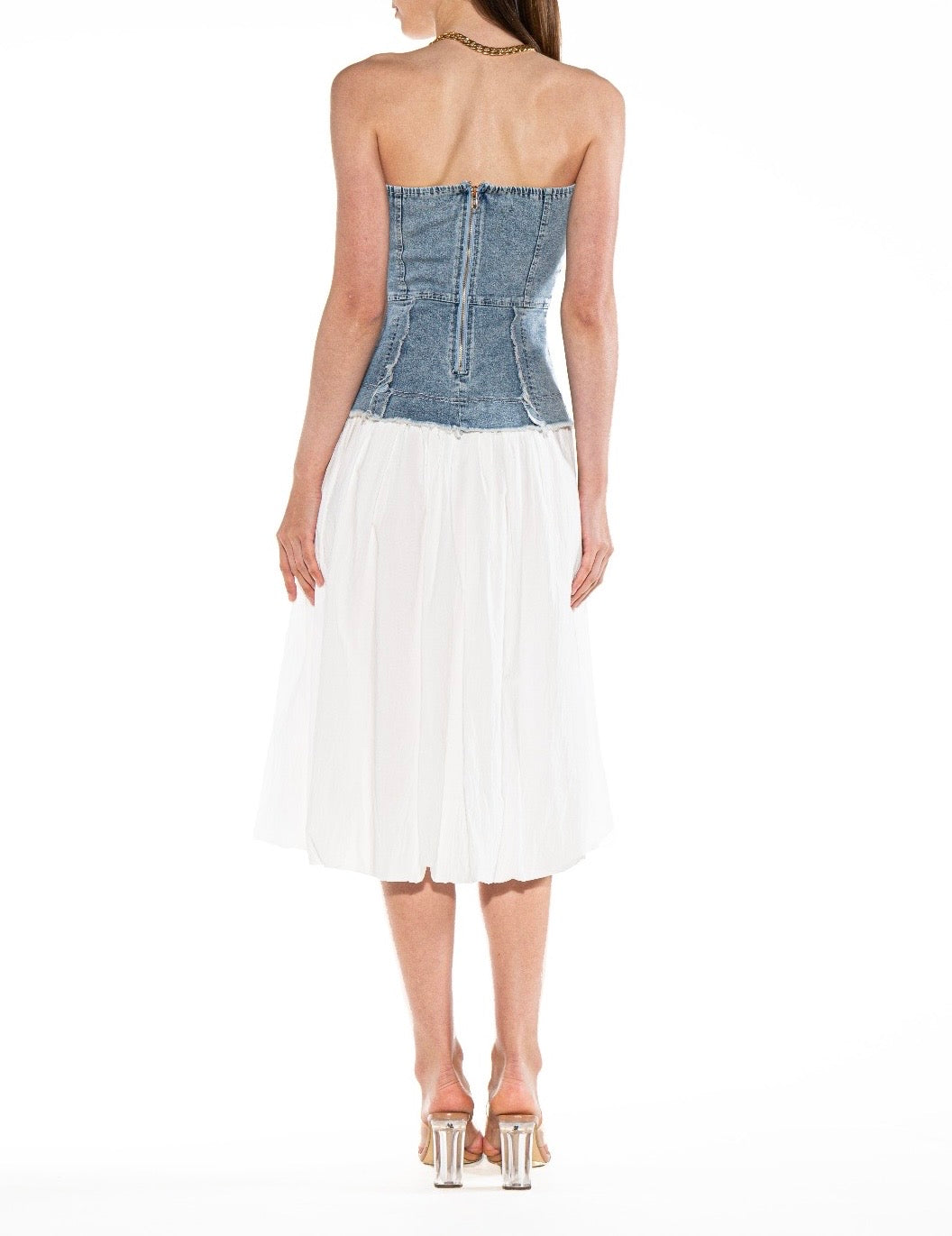 Bring a playful edge to your wardrobe with our Denim Corset Solid Skirt Midi Dress. The structured denim corset adds a bold, flattering shape, while the white cotton midi skirt keeps you cool and comfortable for warm-weather days.