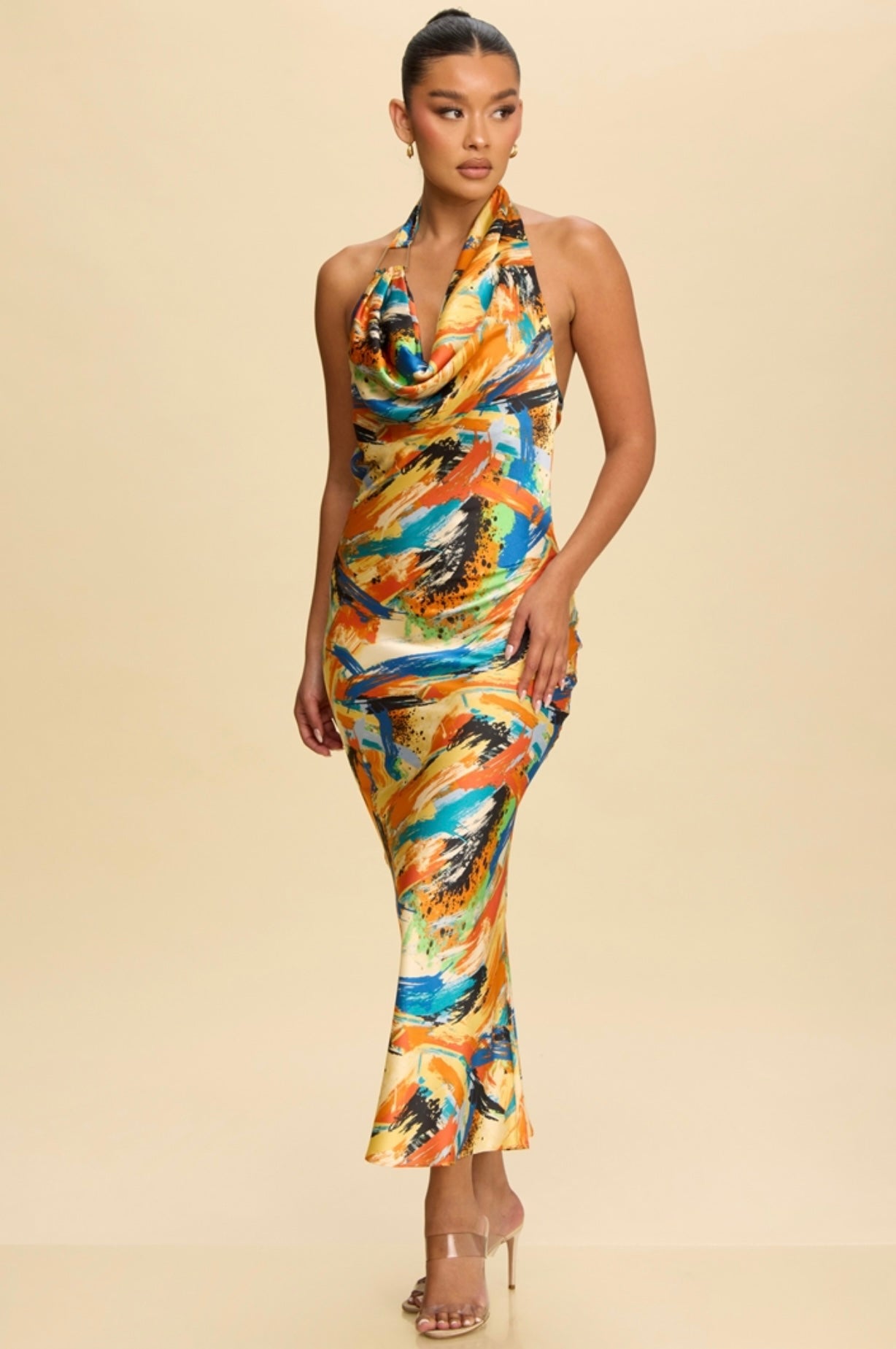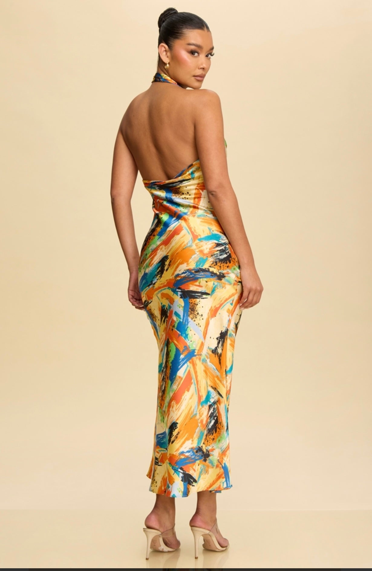 Make a bold entrance in our Multi-Colored Satin Halter Midi Dress, designed to flatter your shape and turn heads.