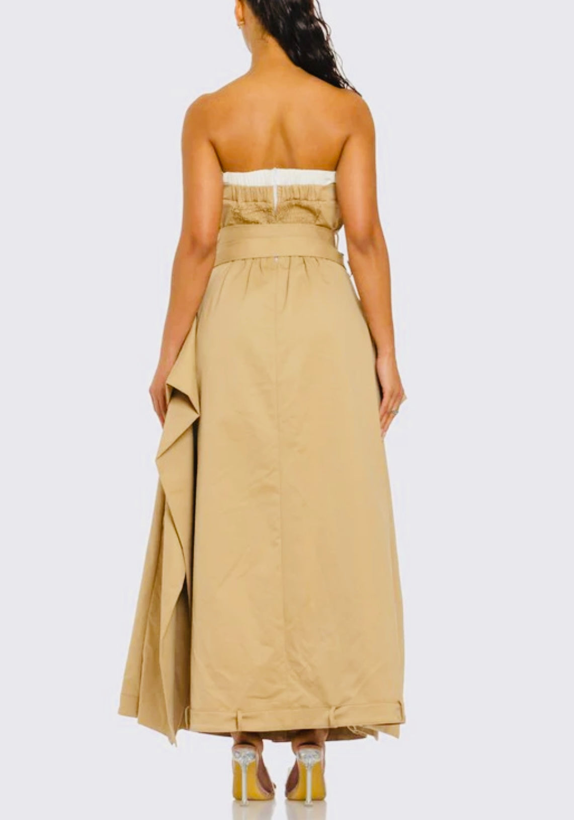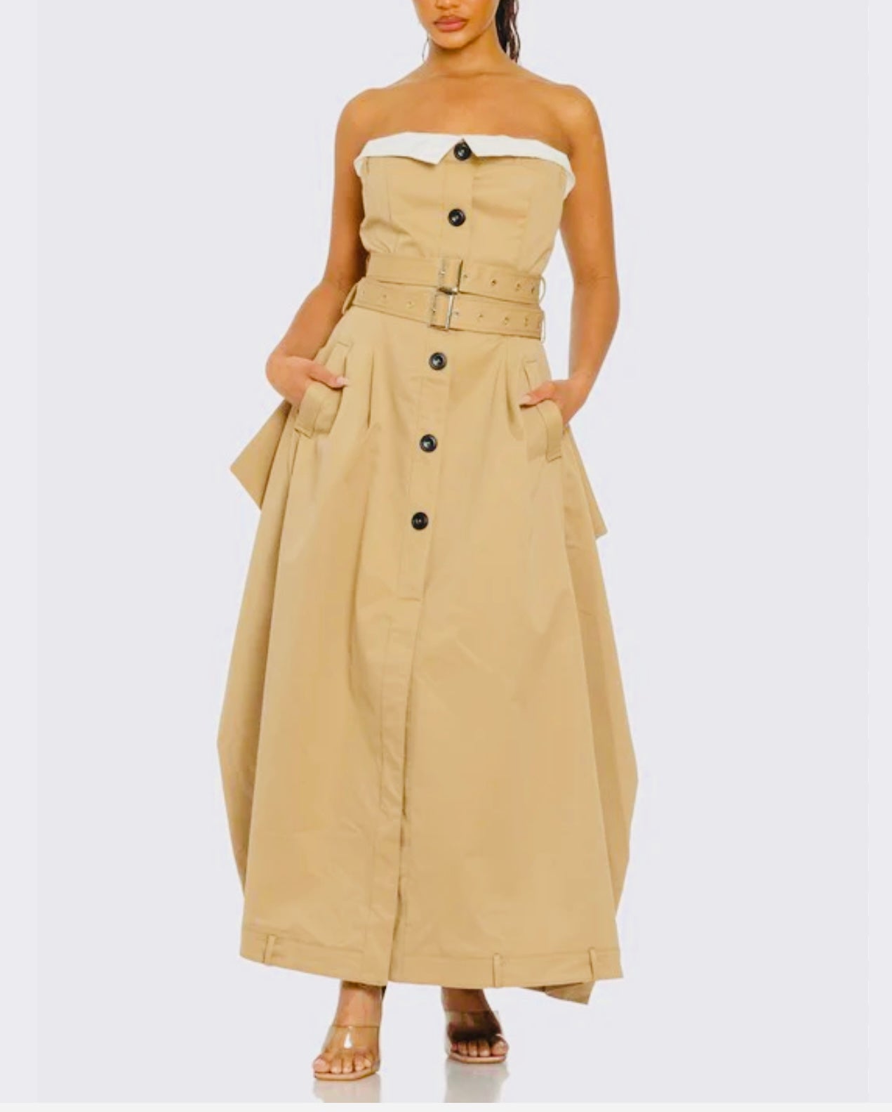 Reinvented Trench Maxi Dress. Designed to mimic the classic trench silhouette, this strapless maxi dress features a structured but down front, wide belt detailing for a cinched waist, and oversized pockets for a functional yet fashion-forward touch. The contra fold-over collar adds an unexpected pop of refinement, while full A-line skirt creates a dramatic, structured finish